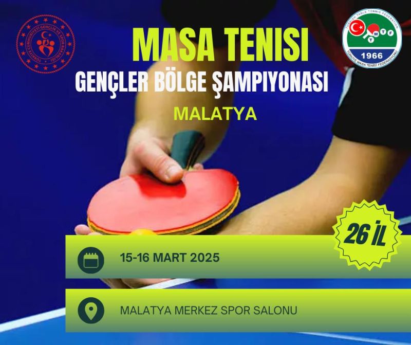 Türkiye Masa Tenisi Federasyonu Faaliyet Programında yer alan Gençler Bölge Şampiyonası 15-16 Mart tarihlerinde Malatya ilinde yapılacak. Malatya Merkez Spor Salonunda yapılacak olan Güneydoğu Anadolu Gençler Bölge Şampiyonasında dereceye girecek olan 4 Erkek 5 Kız takımı Türkiye Şampiyonasına katılmaya hak kazanacak. Bölgedeki en iyi raketlerin mücadele edeceği bu heyecanlı müsabakalara Tüm Masa Tenisi severleri davet ediyoruz.